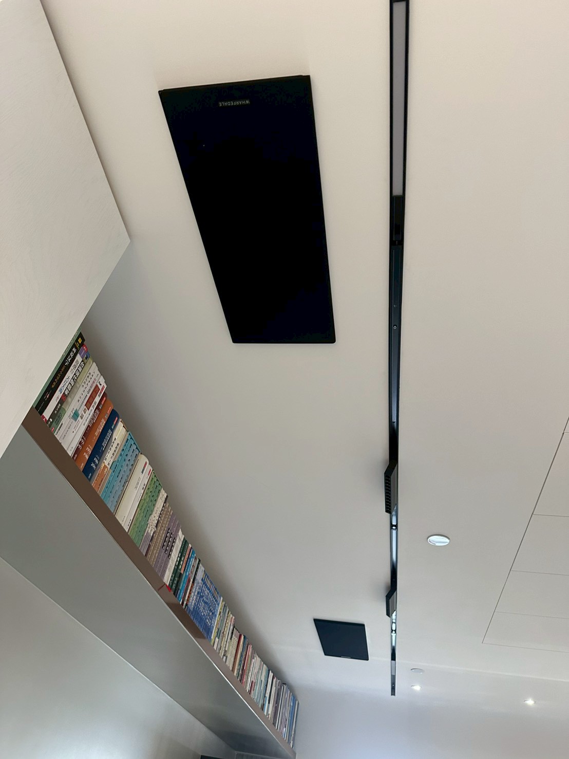 本案選用 Wharfedale 嵌入式喇叭系列,以其溫潤自然的音色著稱,無論是電影音效的衝擊感,還是人聲歌唱的細膩質地,都能完美呈現。搭配沿書架牆延伸的一排嵌入式喇叭,構成完整的環繞聲道配置,視覺上更形成一條俐落的水平線條,反而成為空間設計的一部分。