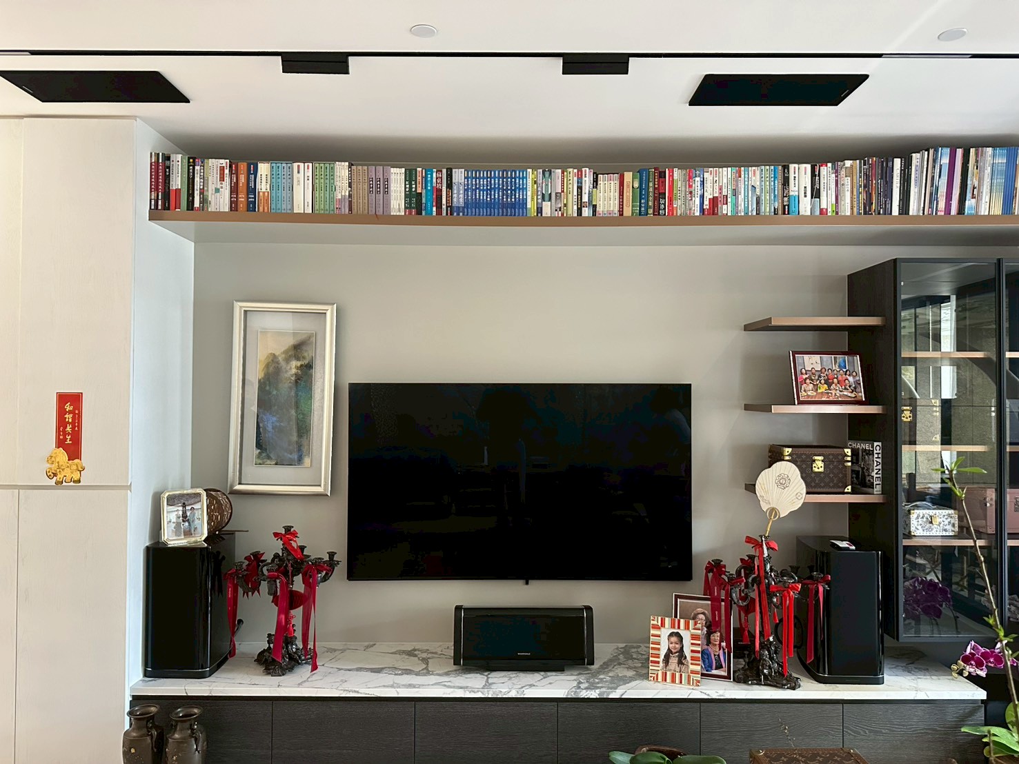 大尺寸電視安裝於大理石電視牆中央,左側搭配山水畫作,右側規劃展示層架,陳設家族照片與精選收藏品。電視下方的大理石台面則放置中置喇叭與裝飾擺件,讓音響設備自然融入家居佈置,形成和諧的視覺整體。