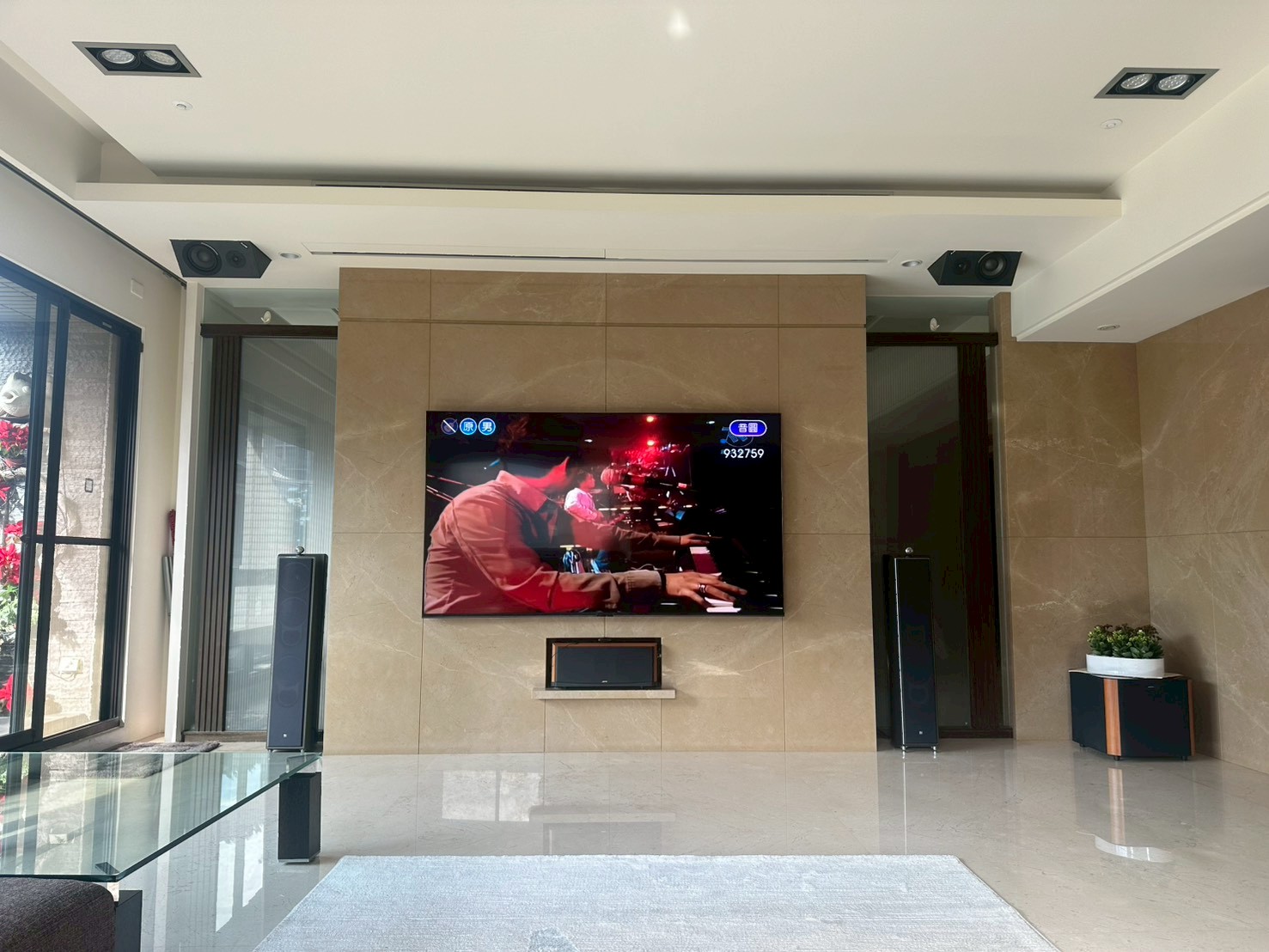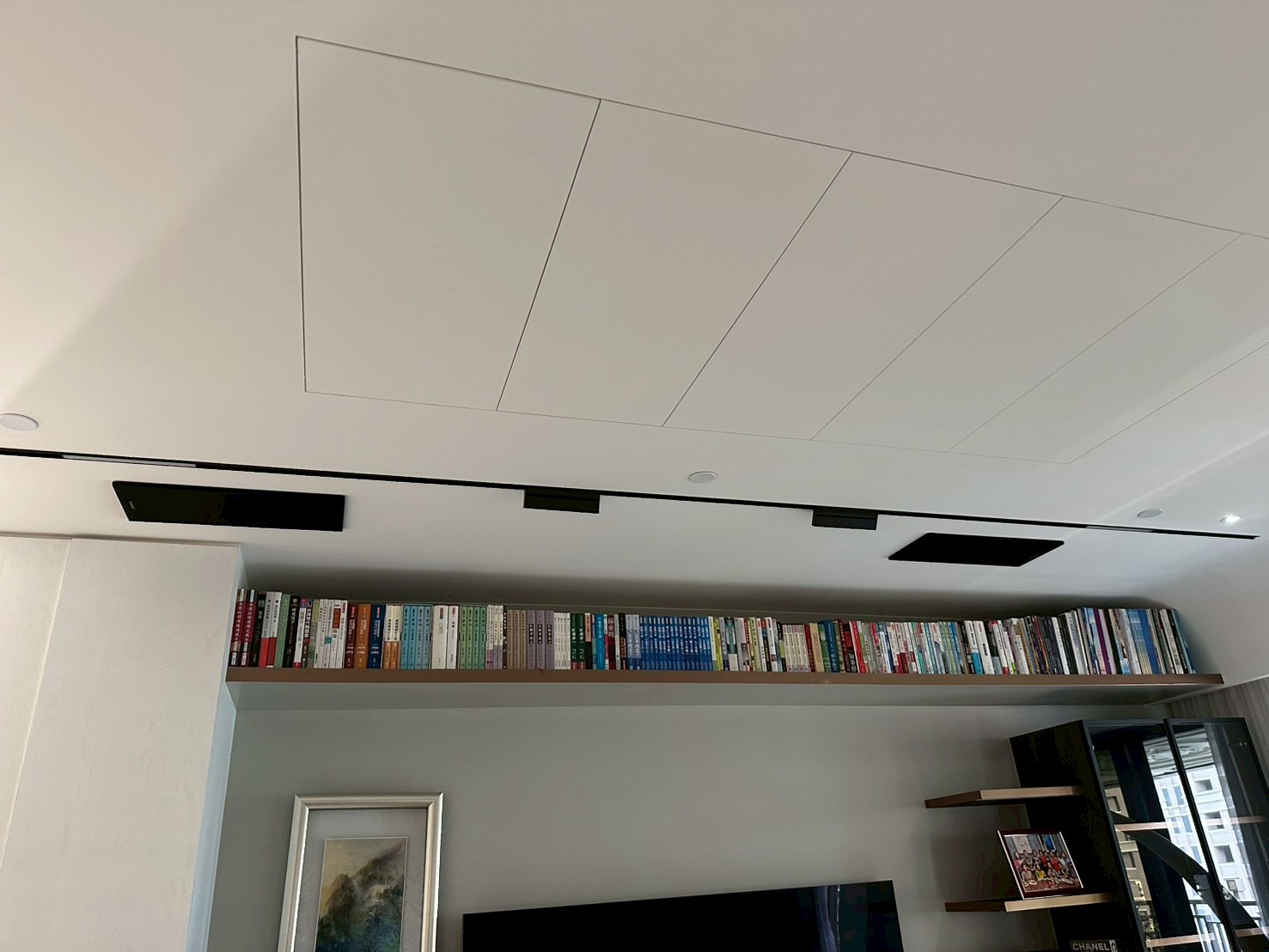 完工後的空間呈現出令人驚艷的效果。從客廳入口望去,映入眼簾的是整面書架牆、優雅的電視牆配置,以及精心陳設的展示收藏——完全看不出這是一個藏有 9.2 聲道環繞音響系統的高端沉浸式影音空間。業主反饋,這套系統徹底改變了家庭的娛樂方式:週末電影夜,大銀幕加上 Dolby Atmos 音效讓觀影體驗媲美電影院;家人聚會時切換卡拉OK模式,全家共歡的氣氛讓客廳成為家中最受歡迎的空間;平日生活中,書架與展示空間依然保有溫暖的生活感,而非冷冰冰的設備展示間。