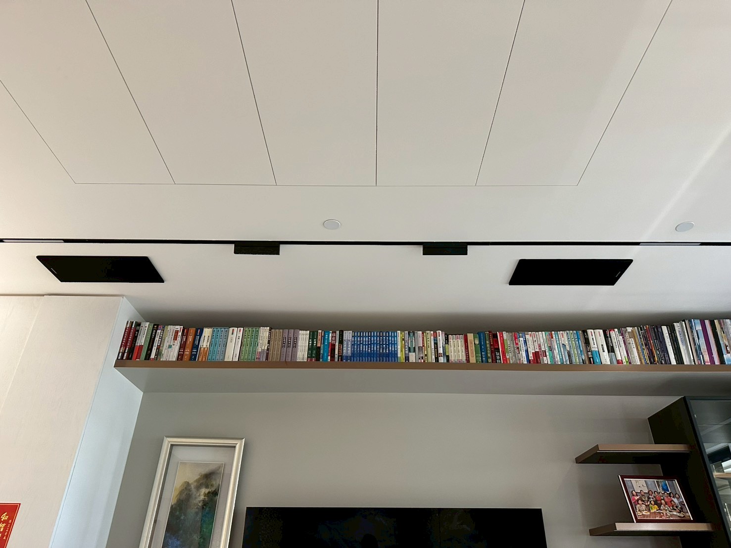 • 視覺零干擾:喇叭隱藏於天花板中,完全不佔用地面或牆面空間,讓展示收藏與書架牆的視覺呈現不受任何干擾